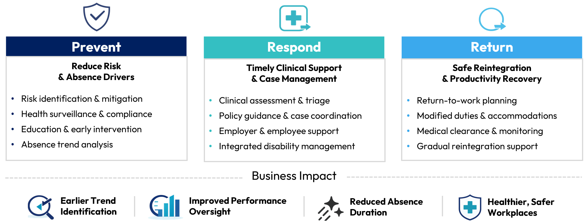 Reduce Avoidable Absences: When an employee is not at work, it can be costly for the individual and their employer. At Workplace Medical, we utilize a three-step process (Prevent, Respond, Return-to-Work), as well as a unique software solution, to keep employees safe and productive. Our return-to-work expertise, evident in our early medical intervention and case management, is unequalled in Canada.